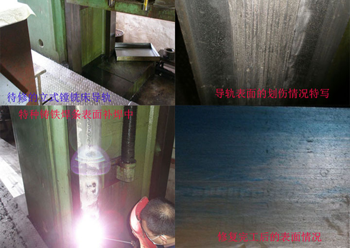 此机床导轨工作面意外得被金属屑及其他杂物拉出长约1200mm,宽约50mm,深度越3mm的伤痕,严重影响了加工精度。该导轨材质为HT200,由于是整体结构,无法拆卸做保温焊接,因此我公司采用特种铸铁焊条对其进行现场免拆装修复,无需加热保温,为客户节省了大量费用和工期。