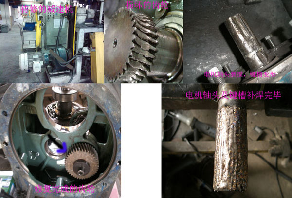 减速机为美国道奇APG 250DM6A 输出功率:75HP 变比:6.2:1 电机型号为西门子RGZVESD 20HP 460V 60HZ 额定转速:1755rpm 损坏情况如下:减速机一对齿轮齿牙严重挤压变形,电机轴整个完全磨小,键槽变形 修复内容:对齿牙进行低温堆焊,并滚齿电机轴整个外圈及键槽低温堆焊,并机加工到标准尺寸